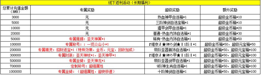 此福利活动只计算真实充值金额,一个账号下仅计算单角色的真实充值进行各档位仅限领取一次,活动随着版本更新进度等可能会出现道具更新内容,若有调整以咨询客服后实际申请到账为准。(真实充值额度:不包含游戏内充值红包等,仅计算玩家真实充值金额)