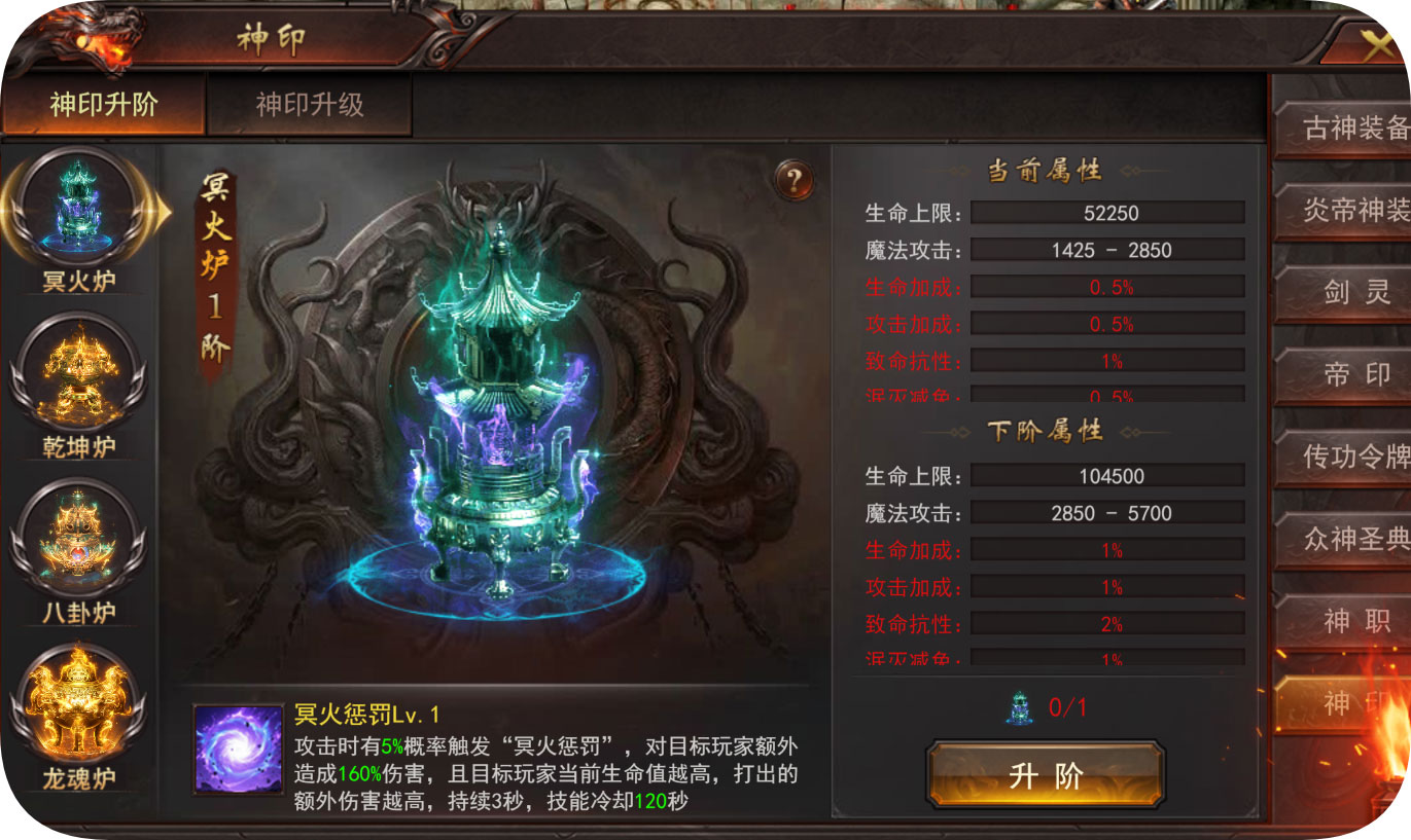 升级神印可提升基础属性加成,升级到指定等级可获得额外效果加成